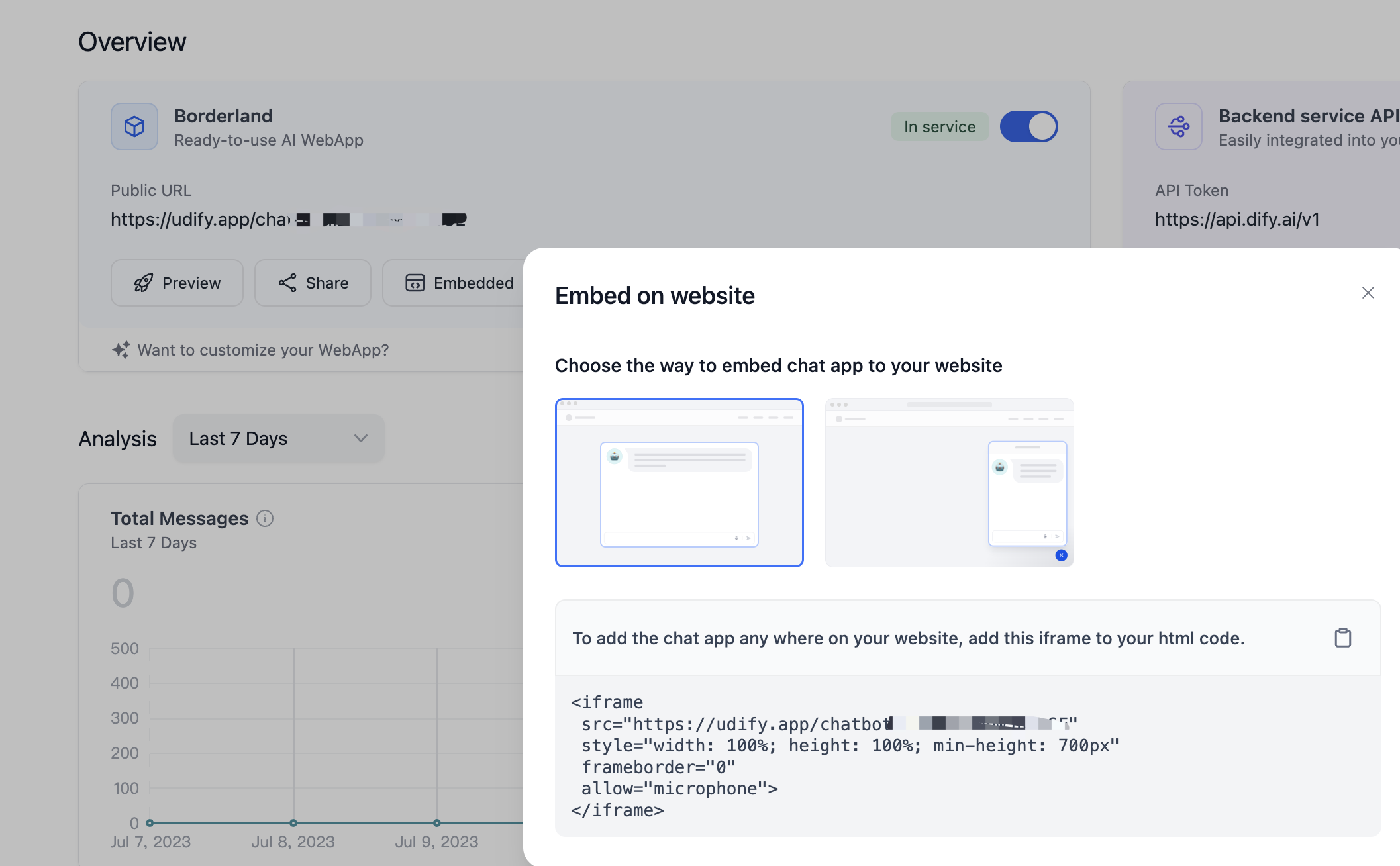 将 iframe 代码复制到你网站用于显示 AI 应用的标签中,如 <div><section> 等标签。