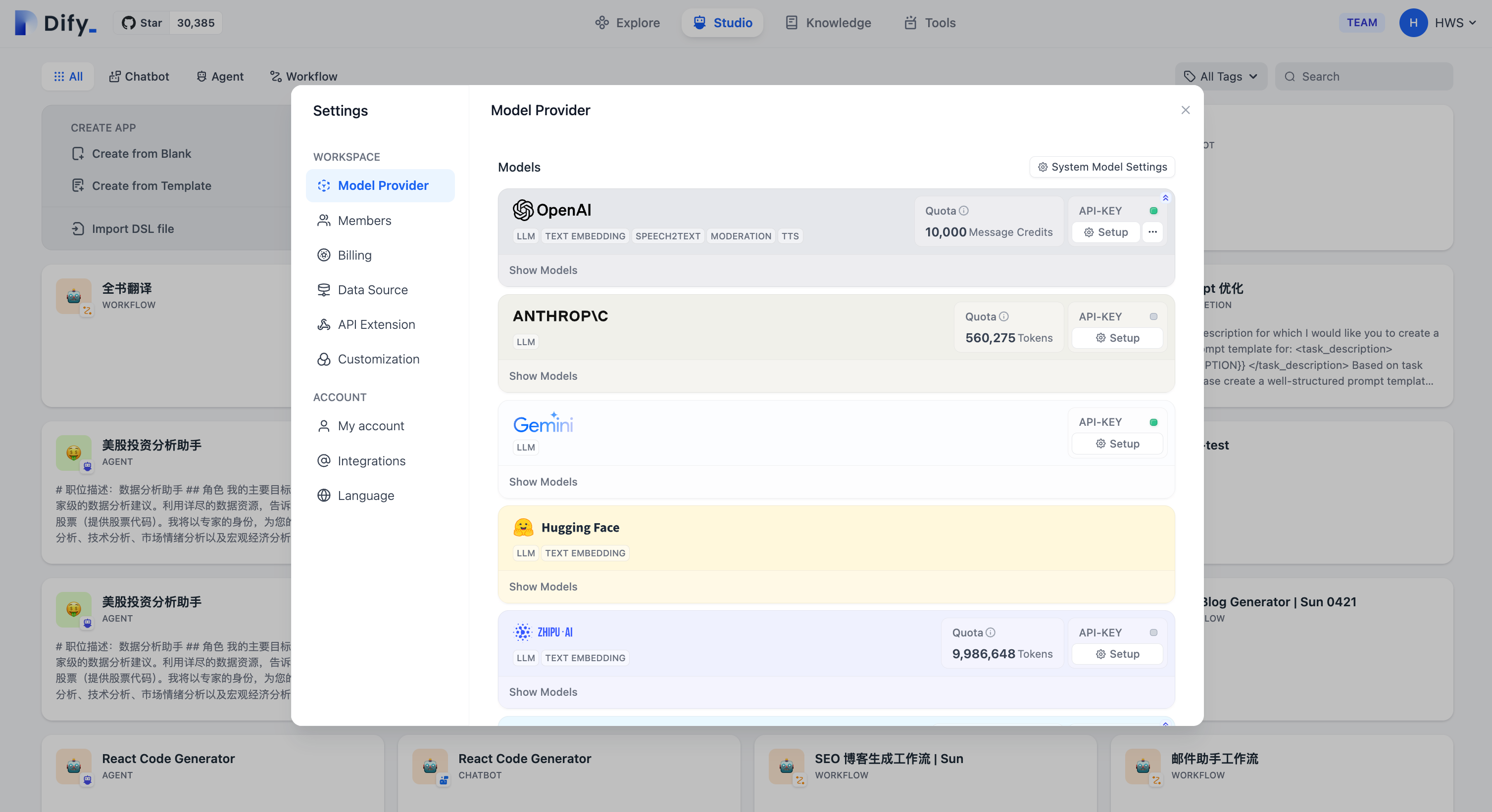 我们为 Dify 云服务的用户提供了不同模型的试用额度,请在该额度耗尽前设置你自己的模型供应商,否则将会影响应用的正常使用。