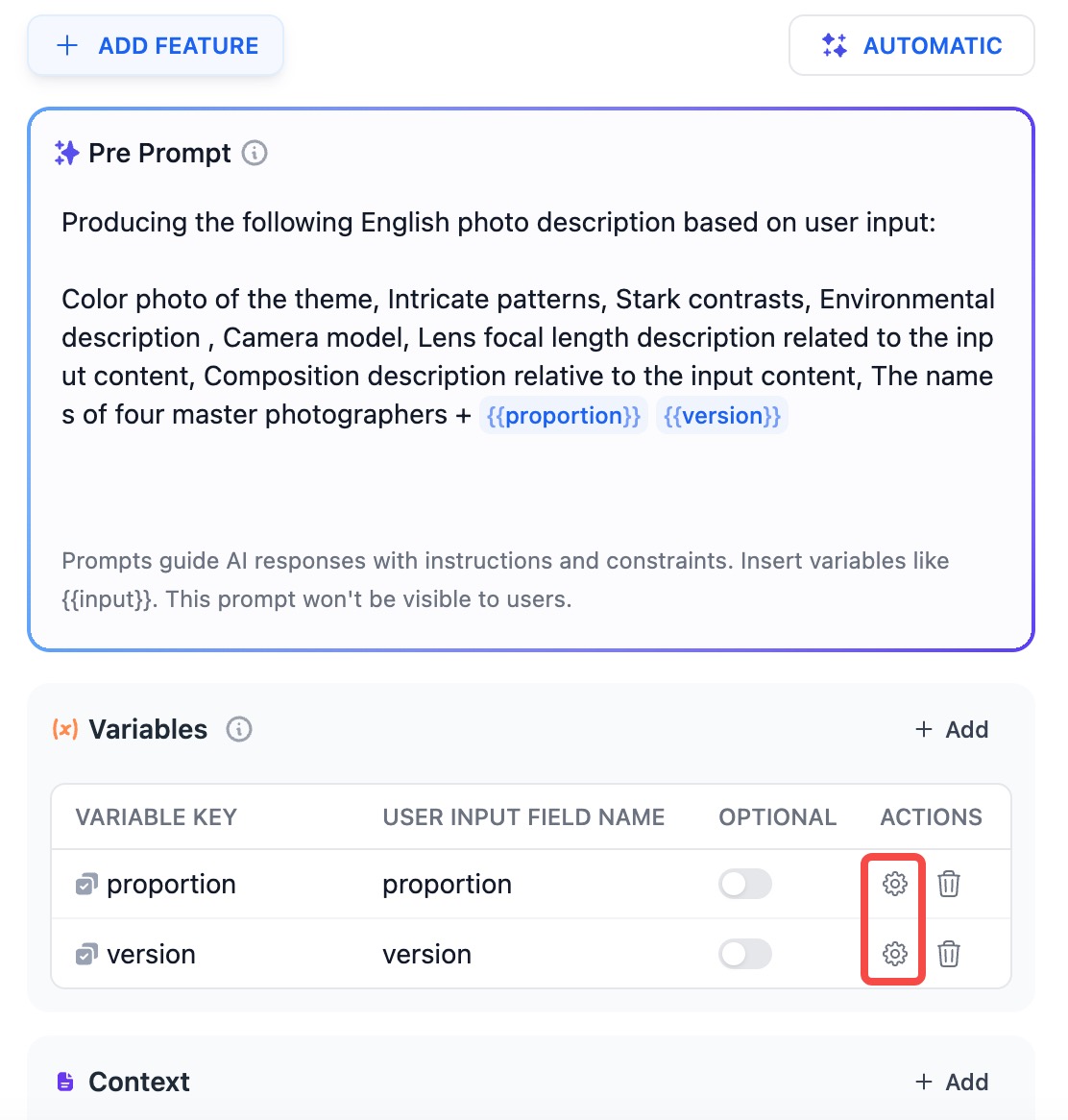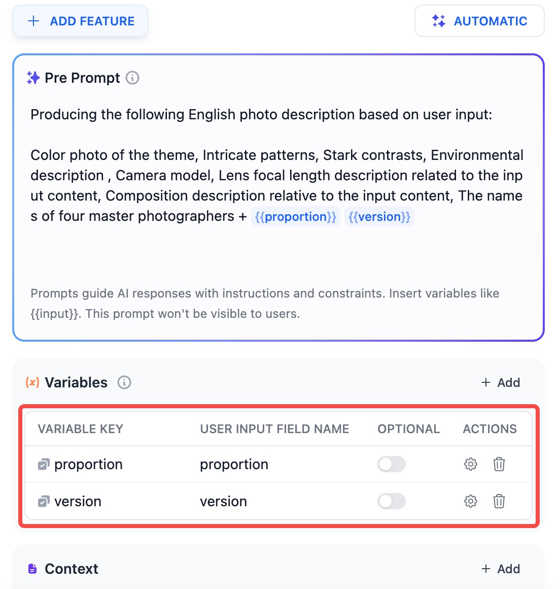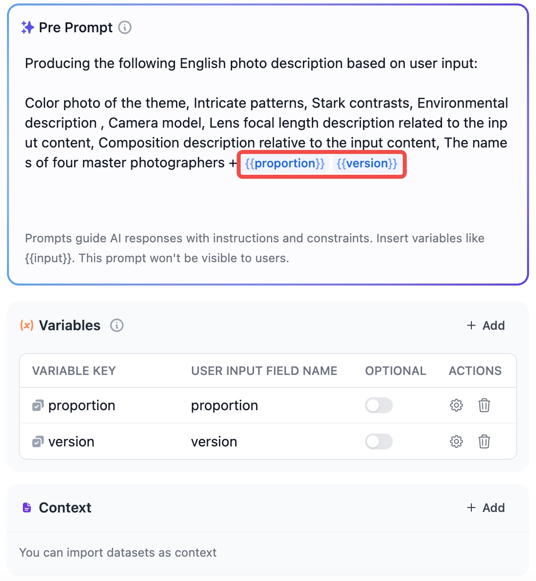 Variables allow us to dynamically incorporate the user's form-filled or selected content into the prompt. For example, I've created two variables: one represents the image proportion, and the other represents the model version. Click the "Add" button to create the variables.