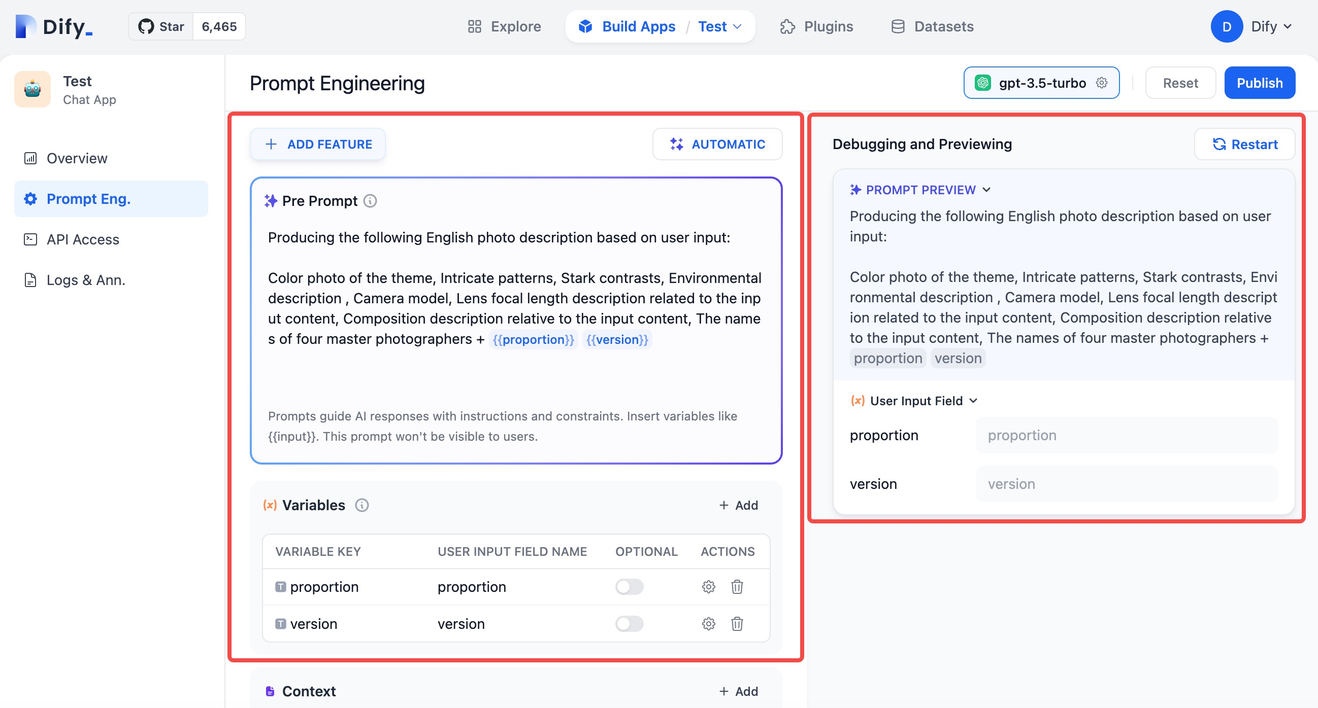 Now, let's use the variables. We need to enclose the variable key within double curly brackets {} and add it to the prefix prompt. Since we want the GPT to output the user-selected content as is, we'll include the phrase "Producing the following English photo description based on user input" in the prompt.