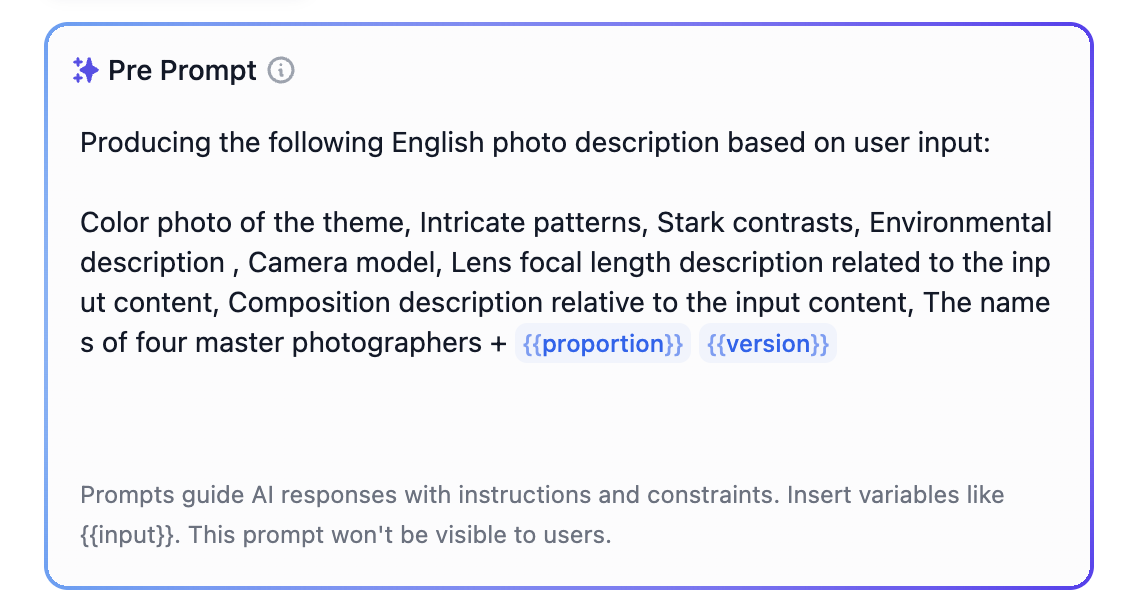 You may have noticed the "{{proportion}}" and "{{version}}" at the end. These are variables used to pass user-selected information. On the right side, users are required to choose image proportions and model versions, and these two variables help carry that information to the end of the prompt. Let's see how to set them up.
